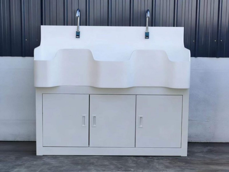 高分子洗手池材质特点:采用高分子材料一次吸塑成型,出水方式有:感应式、膝控式、脚踏式和手动开关,一台洗手池可客户要求选择单一出水方式或多种出水方式。洗手池分高背和低背,高背总高度1800mm,配有美容镜,照明灯,皂液器,可按客户要求配置烘手器和热水器。低背板无配置。