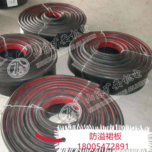 防溢裙边的主题部分为黑色,采用进口天然橡胶和丁苯橡胶混练而成,在保持挺括的基础上增加弹性,是绿色的多护密封条紧密的贴服在输送带上,甚至当多护系统达到使用寿命后能够继续履行防溢裙边的职责