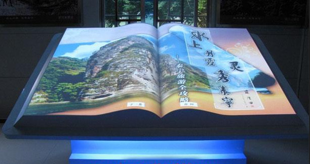 它是在展厅里放置一个按比例放大的实物书模型,并通过液晶电视或投影机投影成像方式在书模上呈现包括文字、图片、声音、图像等多媒体信息的虚拟电子书。参观者只需要站在书模前方,用手在空中挥动, 即可实现翻书动作, 并可对页内内容进行点击、查询等操作。空中翻书的展示形式可广泛应用于博物馆、展览馆、科技馆、企业展厅、图书馆等,或者是一些服务行业的公共场合,进行导览、导购、业绩展示、厂史展示等。